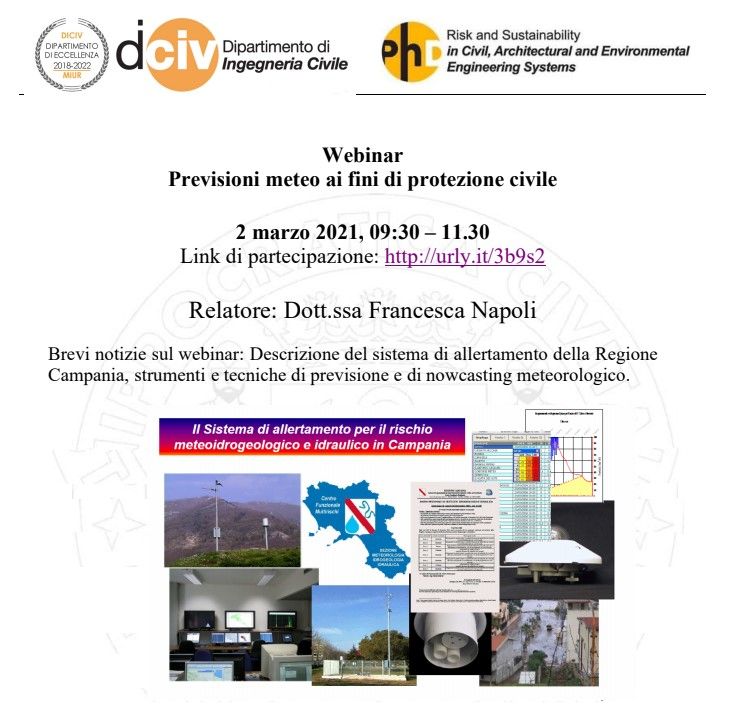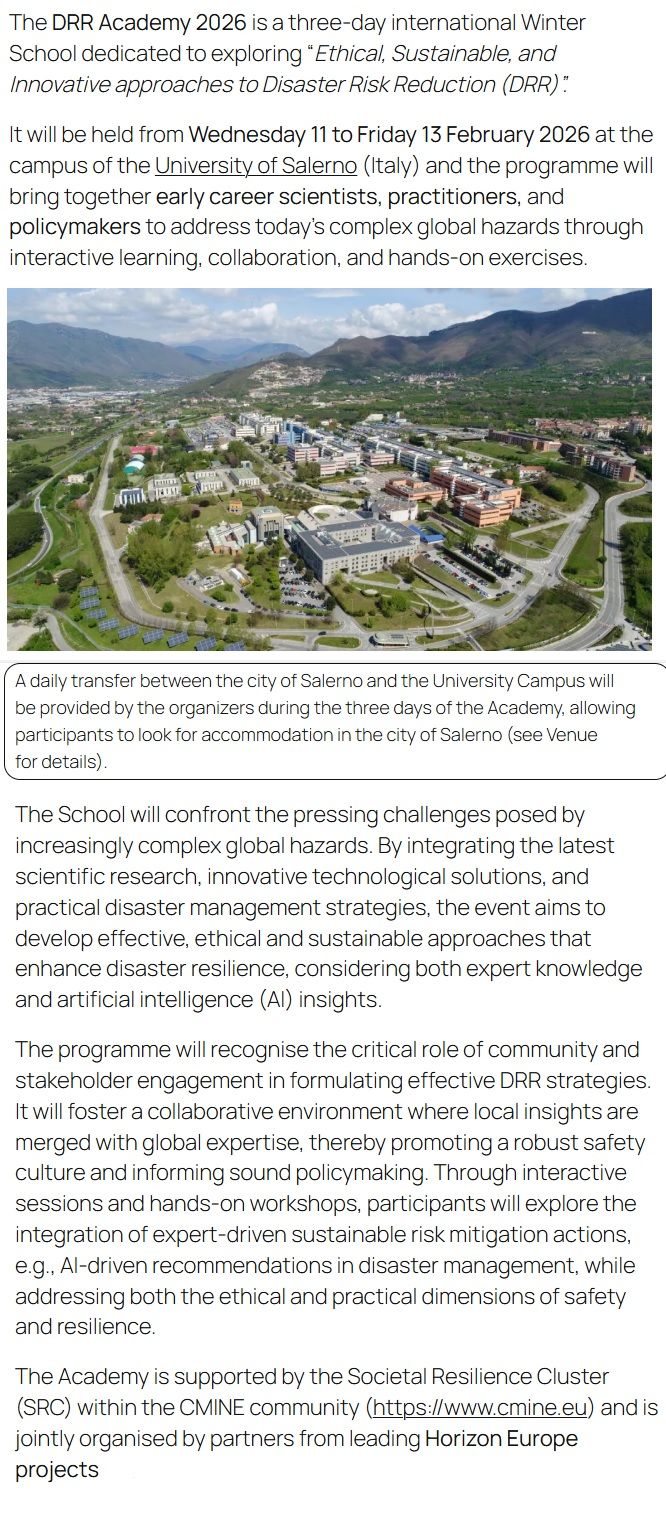 Da Mercoledì 11 a Venerdì 13 febbraio 2026 si svolgerà presso il nostro campus la International Winter School intersciplinare DRR Academy 2026 “Effective, Sustainable and Ethical Disaster Risk Reduction” (https://drracademy2026.wordpress.com/). Il Dipartimento ha deliberato un contributo finanziario (fino a € 1500) per consentire a dottorandi, assegnisti o giovani ricercatori DICIV interessati (fino ad un massimo di 10) di partecipare alla scuola senza pagare personalmente la quota di iscrizione di €150 che garantisce, come scritto nel sito dell’iniziativa, l’ammissione alle sessioni della DRR Academy, coffee breaks e pranzi per i della scuola, una cena sociale a Salerno (Giovedì 12 Febbraio). I dottorandi interessati sono invitati a compilare il seguente Google Form entro Lunedì 22 Dicembre https://forms.gle/nwbTMFBxcYM31EGG6