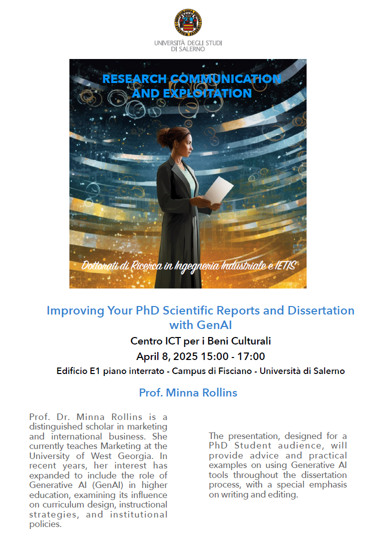 Call for seminar entitled: “Improving Your PhD Scientific Reports and Dissertation with GenAI”, which will be held on Tuesday, April 8, 2025 from 3:00 PM to 5:00 PM CET at the University ICT Center for Cultural Heritage (Basement, Building E1). Attached is the event flyer.