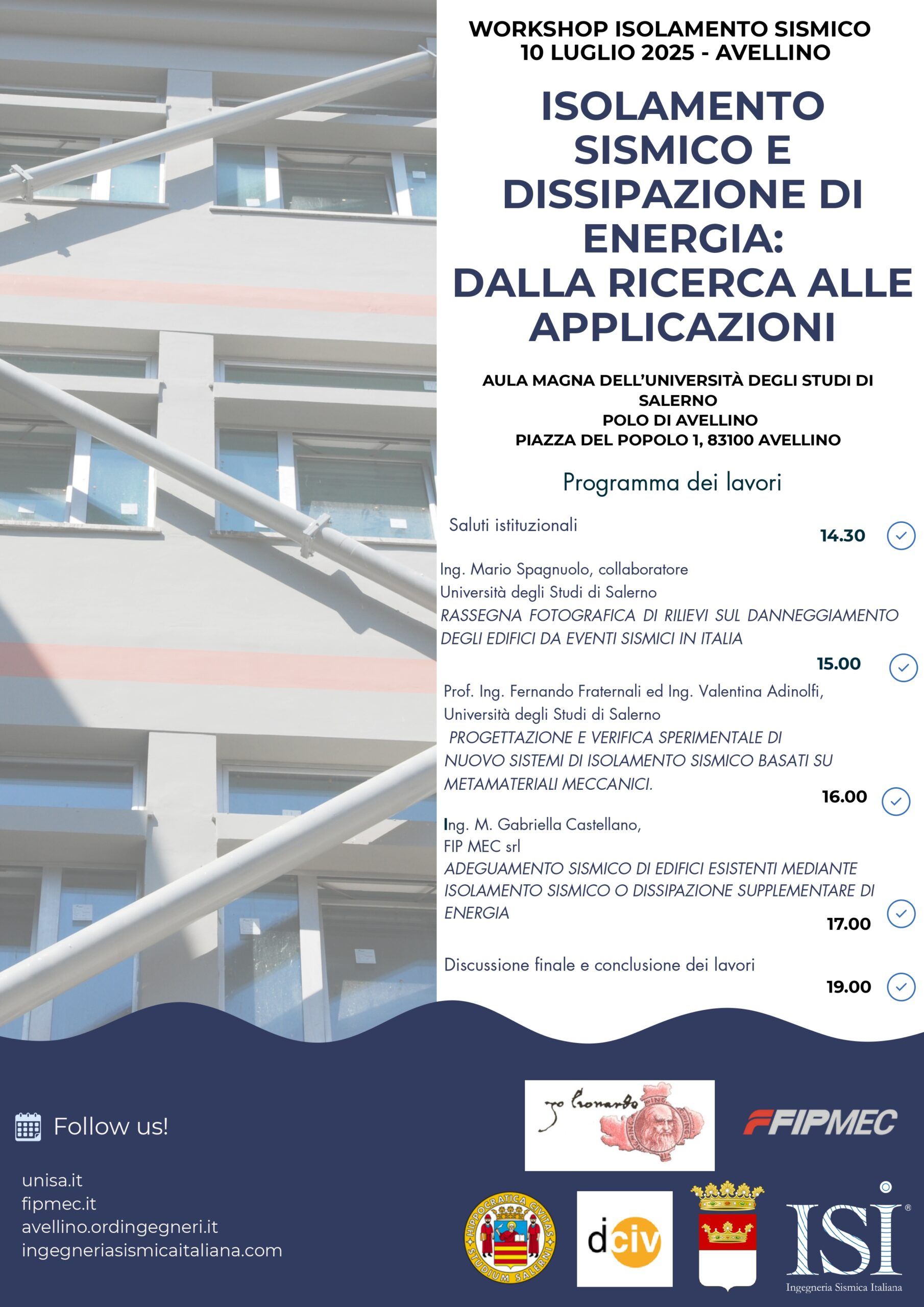 Il workshop esplora l’utilizzo di tecnologie per l’isolamento sismico e la dissipazione di energia negli edifici, presentando esempi pratici di sistemi consolidati e soluzioni innovative basate su metamateriali meccanici. La seconda parte sarà incentrata sull’applicazione di queste tecnologie agli edifici esistenti, focalizzando l’attenzione su strutture intelaiate in calcestruzzo armato e strategie per il miglioramento sismico. Sarà affrontato come l’isolamento sismico permetta interventi localizzati in fondazione, mantenendo l’edificio operativo, e come la dissipazione di energia coinvolge l’intera struttura con interventi esterni che ne riducono il disagio interno. Il workshop si concluderà con una rassegna fotografica di edifici danneggiati da recenti eventi sismici in Italia, offrendo un’analisi concreta delle sfide e delle opportunità di miglioramento.