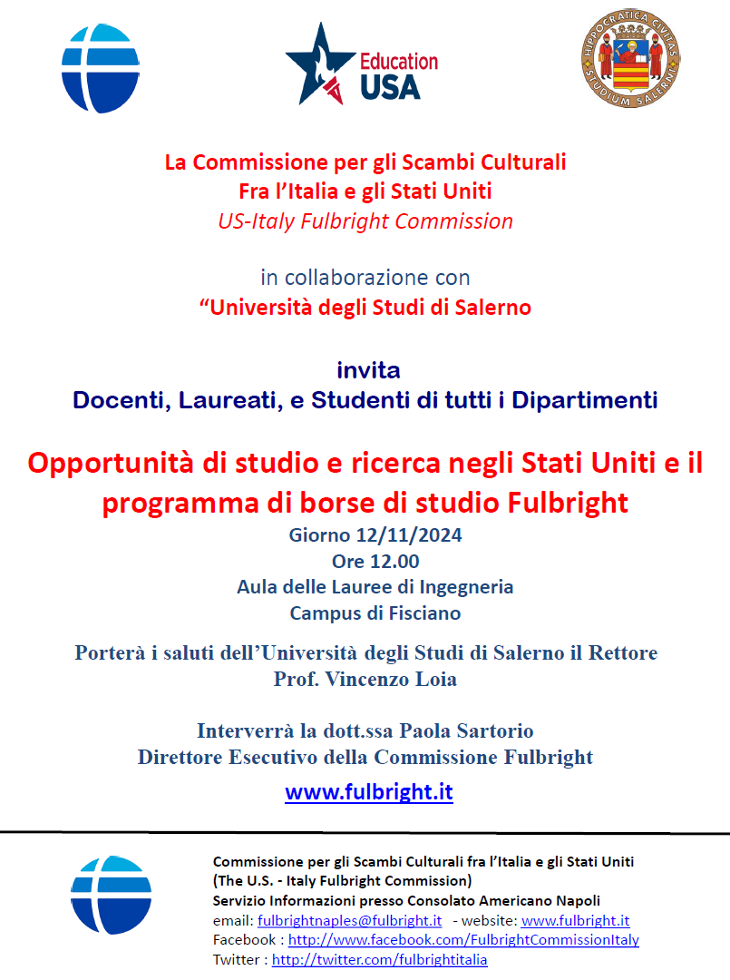 Si comunica che martedì 12 novembre 2024 la dott.ssa Paola Sartorio, Direttore Esecutivo della Commissione Filbright, interverrà su: