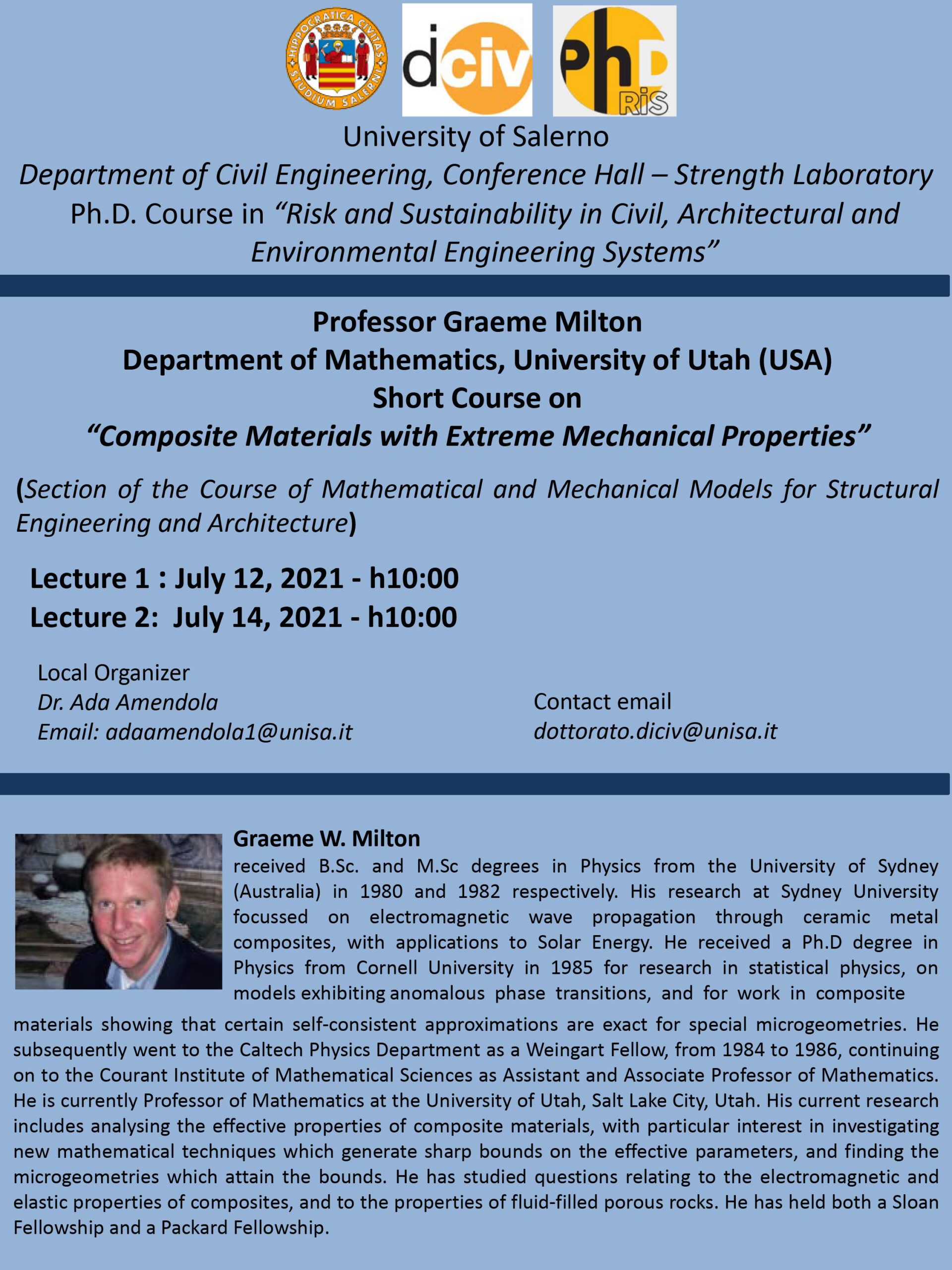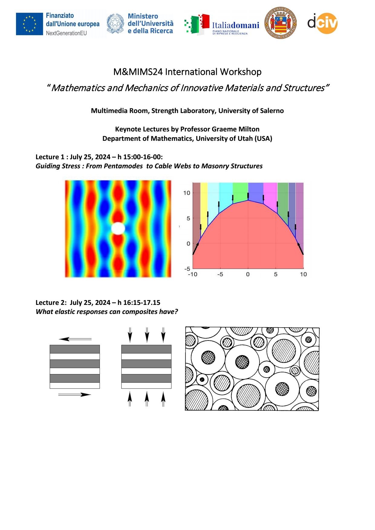 Si comunica che Giovedì 25 Luglio 2024 il Prof. Graeme Milton della University of Utah terrà due importanti seminari nell’ambito del Workshop “Mathematics and Mechanics of Innovative Materials and Structures” (orari 15:00 – 16:00 e 16:15 – 17:15), sulle seguenti tematiche: