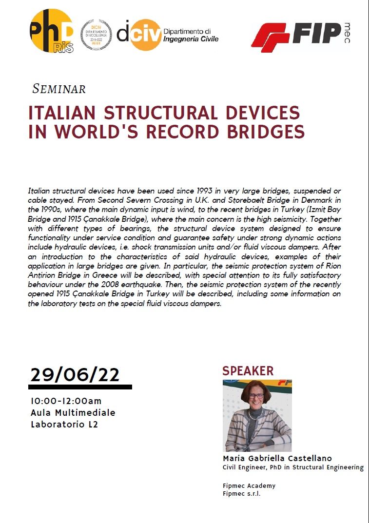 The webinar shortly describes the main types of anti-seismic devices, both seismic isolation and energy dissipation devices. Examples of use in bridges, buildings and other structures are given for each type of device.