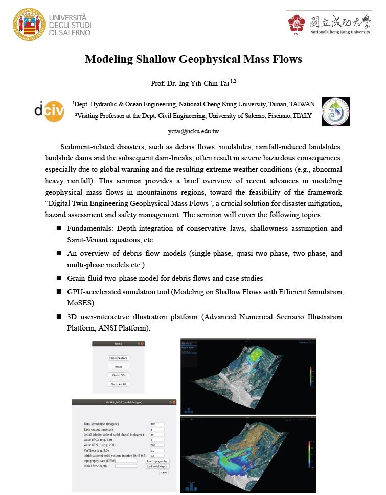 Il seminario dal titolo “Modeling Shallow Geophysical Mass Flows”, sarà tenuto dal visiting professor, prof. Y.-C. Tai, mercoledì 10 settembre (dalle ore 9:00 alle ore 12:00) presso l’aula 102 CAD. In allegato l’abstract del seminario.