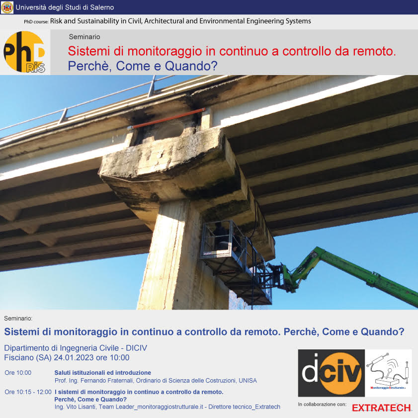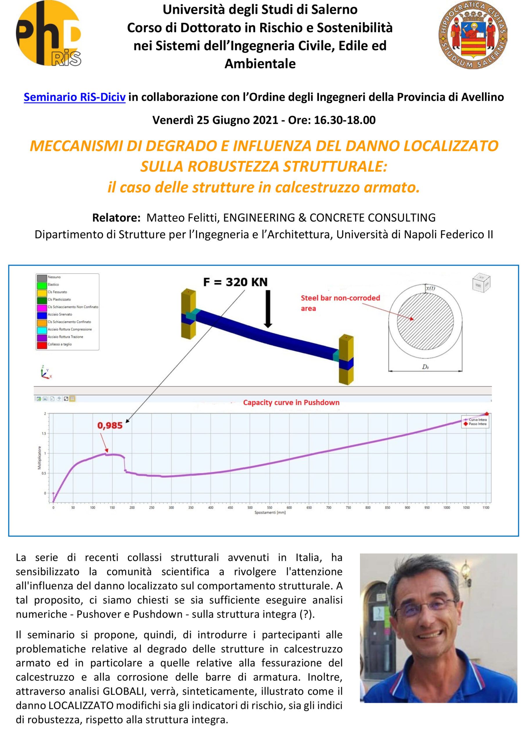 Il seminario si propone di introdurre i partecipanti alle problematiche connesse al degrado delle strutture in calcestruzzo armato ed in particolare a quelle legate alle fessurazione del calcestruzzo ed alla corrosione delle barre di armatura. Inoltre, attraverso analisi numeriche GLOBALI, si illustrerà, sinteticamente, come il danno LOCALIZZATO modifica le curve di capacità e gli indici di robustezza strutturale, rispetto alla struttura integra.