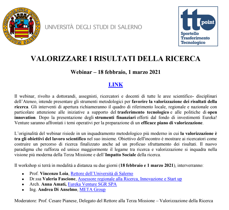 Nell’ambito delle azioni strategiche dell’Ateneo in materia di Terza Missione – Valorizzazione della Conoscenza, l’Università degli Studi di Salerno promuove il Progetto “Giornate delle Terza Missione – Interconnessioni attive tra conoscenza e territorio per la produzione di ecosistemi dell’innovazione”.