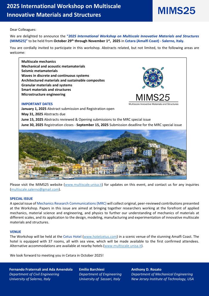 This Workshop is focused on the interdisciplinary area of materials design and modeling at various length and time scales, with emphasis on innovative eco-sustainable materials, nanomaterials and nanostructures, metamaterials, and complex structures